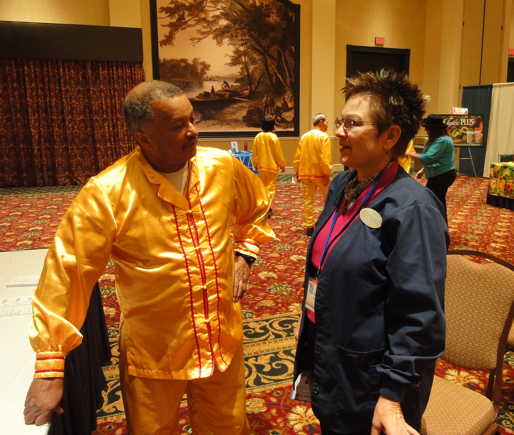 足疗按摩师西娜在这个博览会上有一个展位,当法轮功学员在下午做第二次功法演示的时候,西娜很专心地从头看到尾。结束后,问她有什么问题时,西娜告诉学员,她以前学过法轮功,后来却失去了和当地学员的联系,就再没有机会找到法轮功了,没想到今天遇到了。法轮功学员马丁和西娜住在同一地区,就问她是否是跟一位中国学员学过法轮功,她说是的。