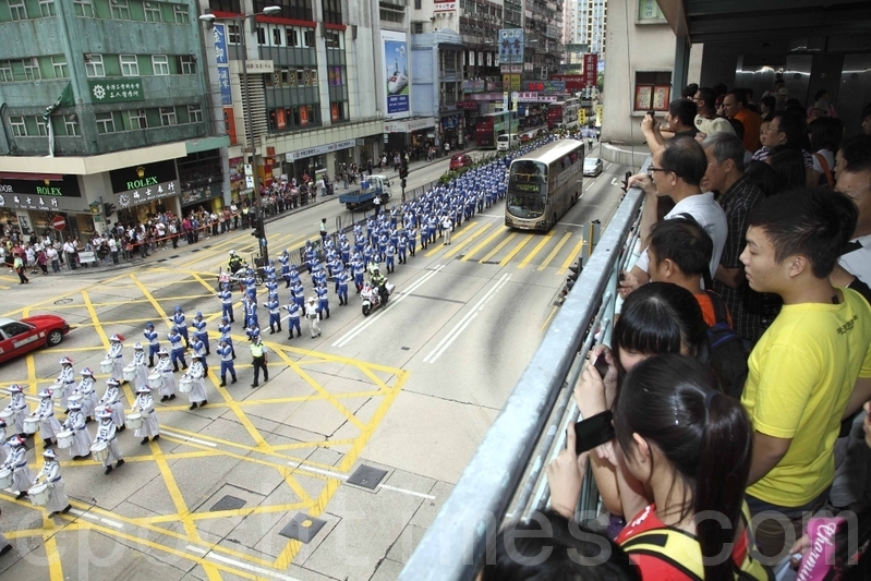 二零一一年国殇日,八百多名法轮功学员的游行队伍在天国乐团的领头下,由长沙湾游乐场出发,途经九龙多个繁华街道,大批人潮在马路两旁观看拍照。