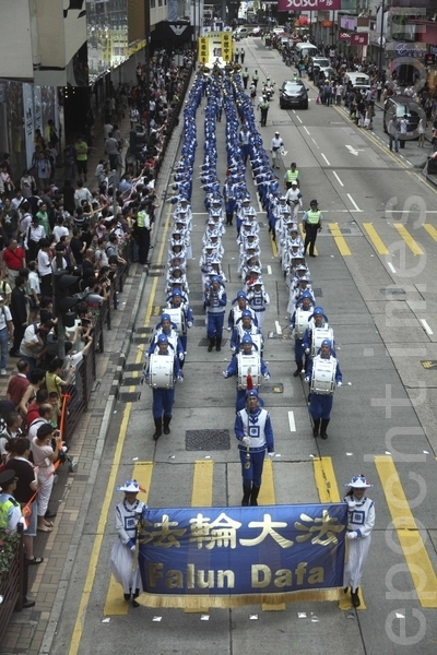 打头的“天国乐团”真雄壮,他们迈着整齐的步伐,边走边演奏着大法的乐曲,无比的威严,无比的美,美的无法形容;中段的新唐人电视台“旗鼓队”,人数不多却很威武,随鼓声而舞动的黄色旗帜,把那的邪恶横扫没了;游行队伍最后的“腰鼓队”在“法轮大法好”的歌声中而起鼓齐舞,也很好看、很威风。整个游行队伍就是一条巨龙,在弥敦道上遨游着,在挽救着在道两边观看的可贵的中国人。