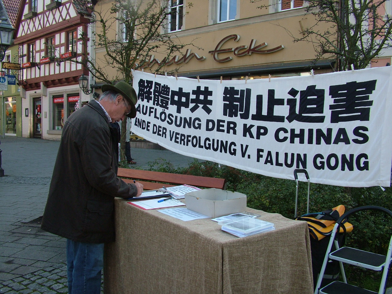 现场各种真相展板和图片,以及扩音器中播放的关于中共活体摘取法轮功学员器官的录音,吸引了很多德国人驻足了解详情,并签名谴责中共暴行。一些德国人看着大横幅“解体中共,制止迫害”,读出声来,陷入思考,逐一把十多个展板的图片和解说都读完,拿取传单,然后在反迫害签名簿上签名。