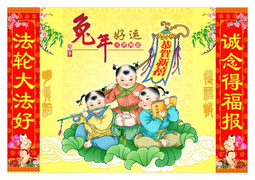 【明慧网二零一一年二月十四日】(明慧网通讯员广东报道)这是一张漂亮的年画:三位仙童坐在莲花上,其中一位手举如意幡,上书“恭贺新禧”;一位吹着仙笛;另一位手捧宝书。年画的上端写着“兔年好运 吉祥如意”,左右两旁各有一条红底金字的条幅:“法轮大法好”和“诚念得福报”相衬。就是这样一张充满传统过年节日气氛的年画,却成了中共警察绑架、抄家、关进看守所迫害好人的所谓“证据”,这究竟是怎么回事呢?