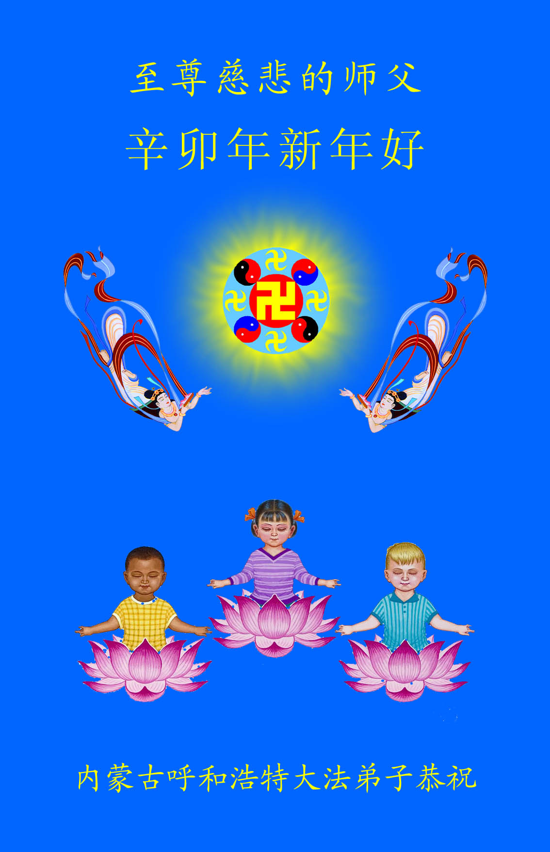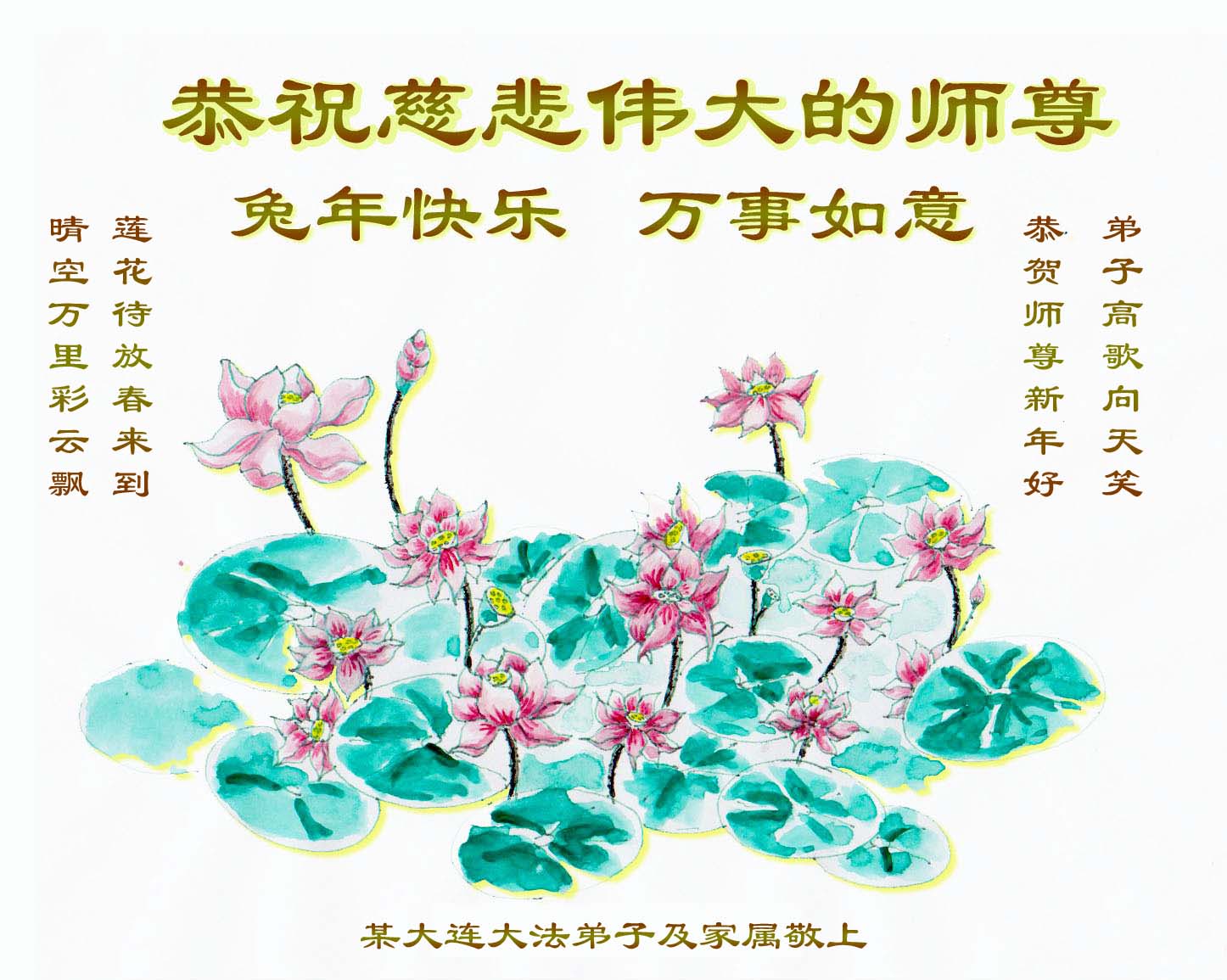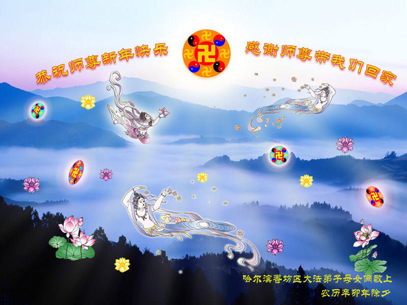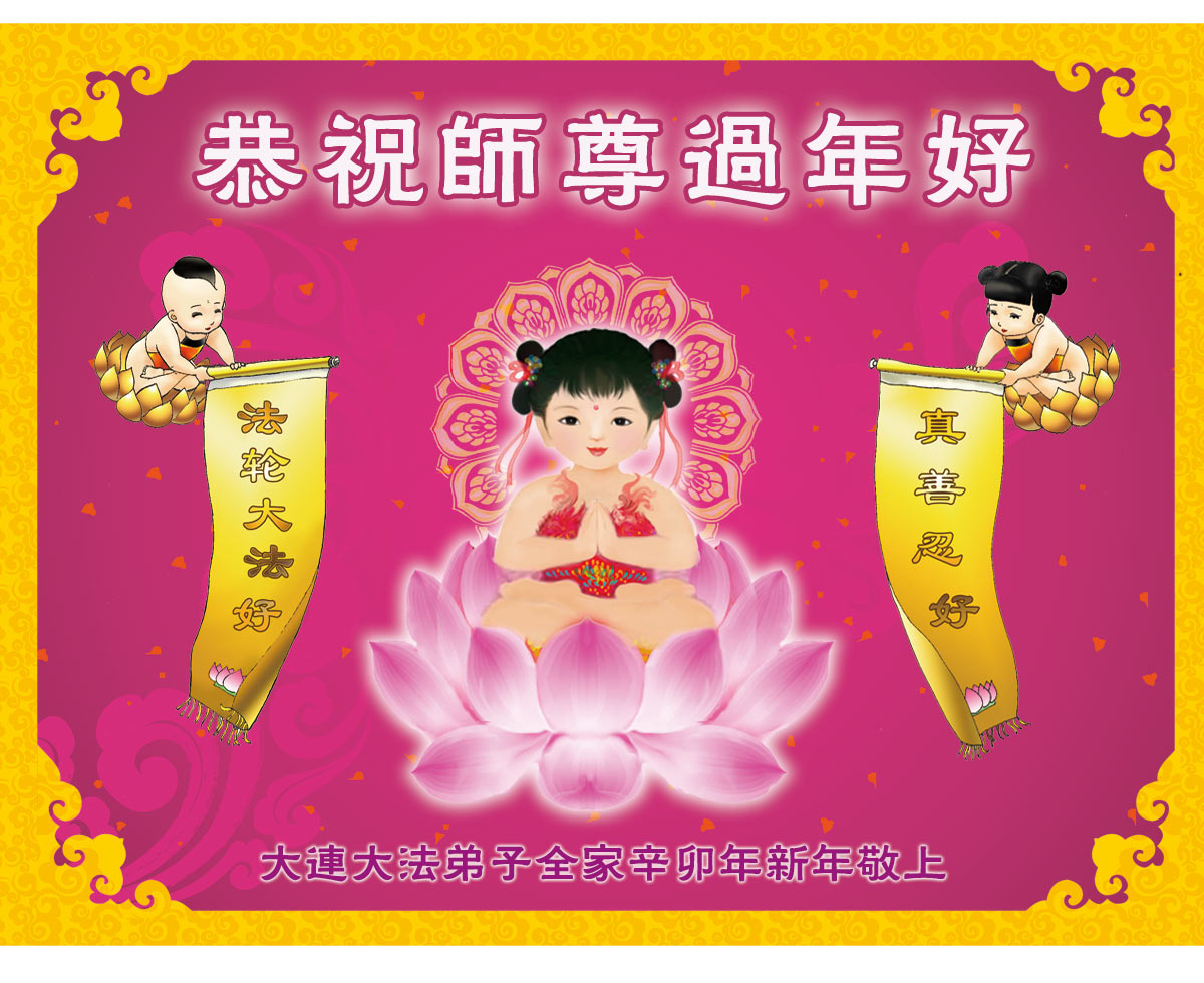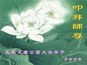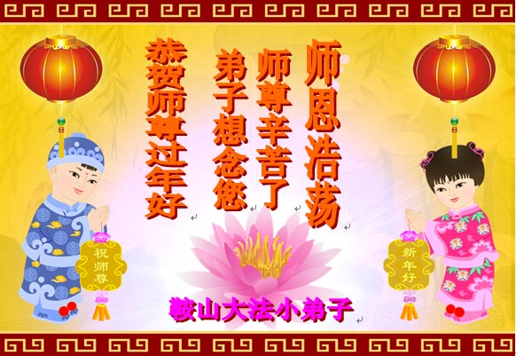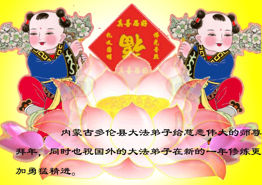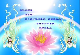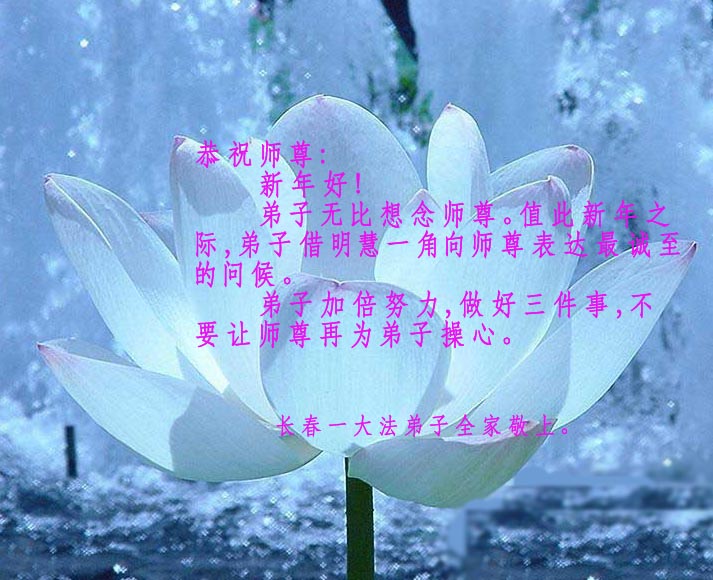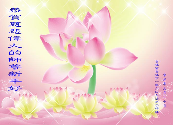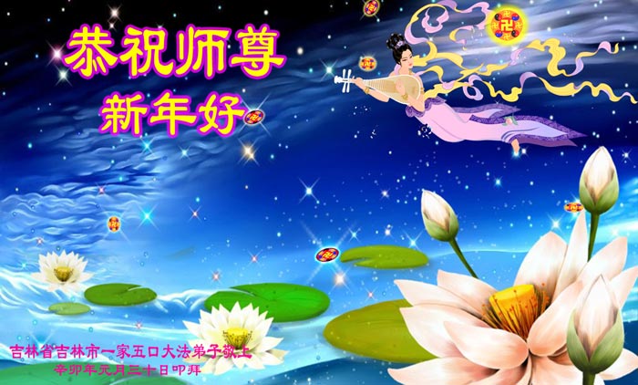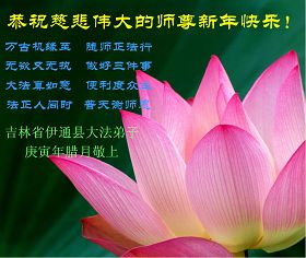 师尊您辛苦了!为了救度更多的众生,为了弟子们都能够圆满,在证实法、救度众生的修炼路上,您牵着弟子的手,慈悲呵护着弟子走过了一年又一年。人类的语言无法表达弟子对师尊的无限感恩。这些年里,每次提笔写贺词恭祝师尊好时,都是伴随着感恩的泪水而成文。弟子只有更加精進的做好三件事,才能不辜负师尊的慈悲苦度,在新的一年里,用正念正行来回报师尊给予的所有。在此代表被非法关押在公主岭监狱的外甥、黑嘴子女子劳教所的姐姐向慈悲伟大的师尊拜年!恭祝师尊过年好!
