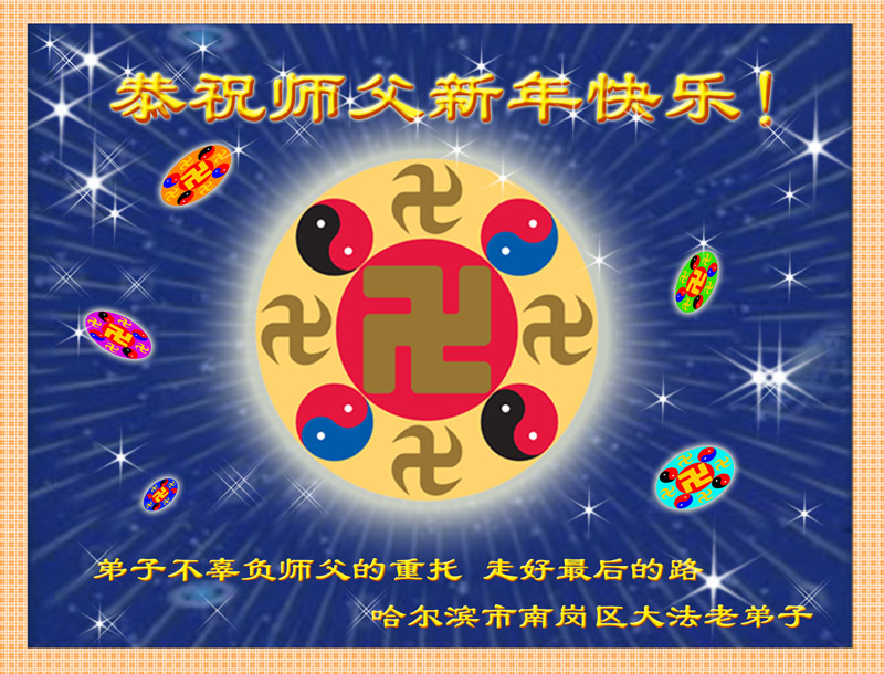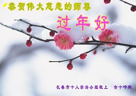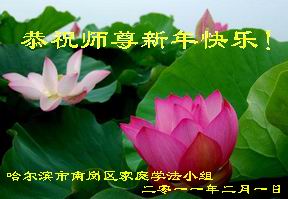 我们四人学法小组在师尊的呵护下,风雨中已走过了三个年头。我们自知离法的要求差距太大,知道自己精進不够。有师在、有法在、就有大法弟子的正信在!在新的一年里,我们要真正精進实修,承担起一个大法弟子的责任、使命,不负师尊慈悲苦度,不负众生的期盼。配合好,做好三件事,多救度众生。迎师尊归来!随师尊回家!哈尔滨所有被非法关押迫害的同修,我们深知你们更想念师尊,请允许我们代表你们一起向师尊拜年!恭祝慈悲伟大的师尊新年快乐!新年好!