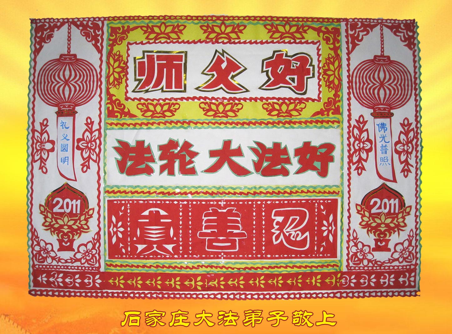 当二零一一年大年来临之际,长沙一家庭资料点大法弟子恭祝师父过年快乐!感谢师尊的慈悲苦度,是伟大的师尊把我们从地狱中捞起,给了我们一部上天的阶梯,又给我们安排了一条提高的修炼之路,慈悲地呵护着我们走到了今天,我们无法用人类的语言表达对师尊的感激之情!只有谨遵师尊的教导,弟子们将扎扎实实的学好法,勤修心性,努力做好三件事,不辜负师尊赐予的大法弟子的称号!