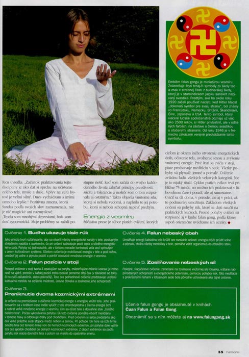 二零零五年十月,斯洛伐克版的《和睦》杂志刊登了一篇介绍法轮功的报导。文章描述了法轮功的法理、功法和法轮图形,在中国的迅速传播和江氏集团发动对法轮功的迫害。