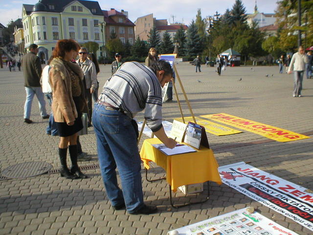 斯洛伐克民众在请愿书上签名,抗议中共迫害法轮功。