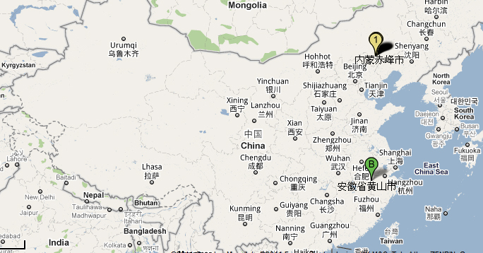 ![]() 内蒙赤峰市和安徽省黄山市地理位置 |