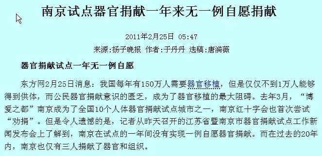 【明慧网二零一一年三月八日】(明慧记者荷雨综合报导)二零一零年二月二十五日,《扬子晚报》报导,据日前召开的江苏省暨南京市器官捐献试点工作新闻发布会信息,自去年三月成为全国十个人体器官捐献试点城市之一以来,南京整年来没实现一例自愿器官捐献,并且在过去的二十年内,南京也仅有三人捐献了器官组织。这与支撑中国这个器官移植大国所需器官数量的巨大反差再度引起世人的关注和质疑。