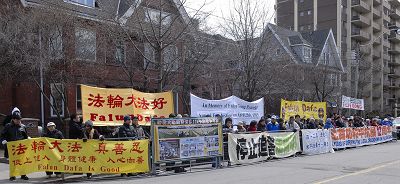 【明慧网二零一一年四月二十三日】(明慧记者章韵多伦多报道)二零一一年四月二十一日中午,法轮功学员在加拿大多伦多中领馆前集会。如同一九九九年四月二十五日发生在北京的万人上访,他们没有激烈的行动,没有喊口号,而是理性平和地向路人讲述他们的故事,揭露中共对法轮功长达近十二年的迫害,并呼吁世人共同制止这场迫害。