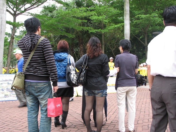 一位大陆游客在展板前停留许久,庭瑛走向前询问有入过党团队吗?游客点头。庭瑛说,“当你入党组织时你答应跟它在一起誓死为其效忠,但中共干了这么伤天害理的事,是要血债血还的,最后天要灭它时您就要当陪葬品。”庭瑛又告诉她,“其实有个方法很简单,退出这组织,即使是取化名退出也算数。”对方问:那为什么取化名退了就算数呢?“是因为要退给老天爷看的,是天要灭中共,你退了,就与中共划清界限。”这位妇女点头同意。