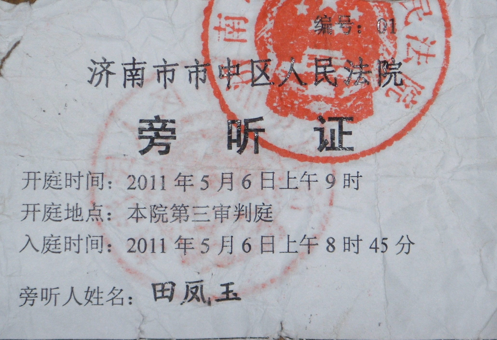 田凤玉的旁听证正面