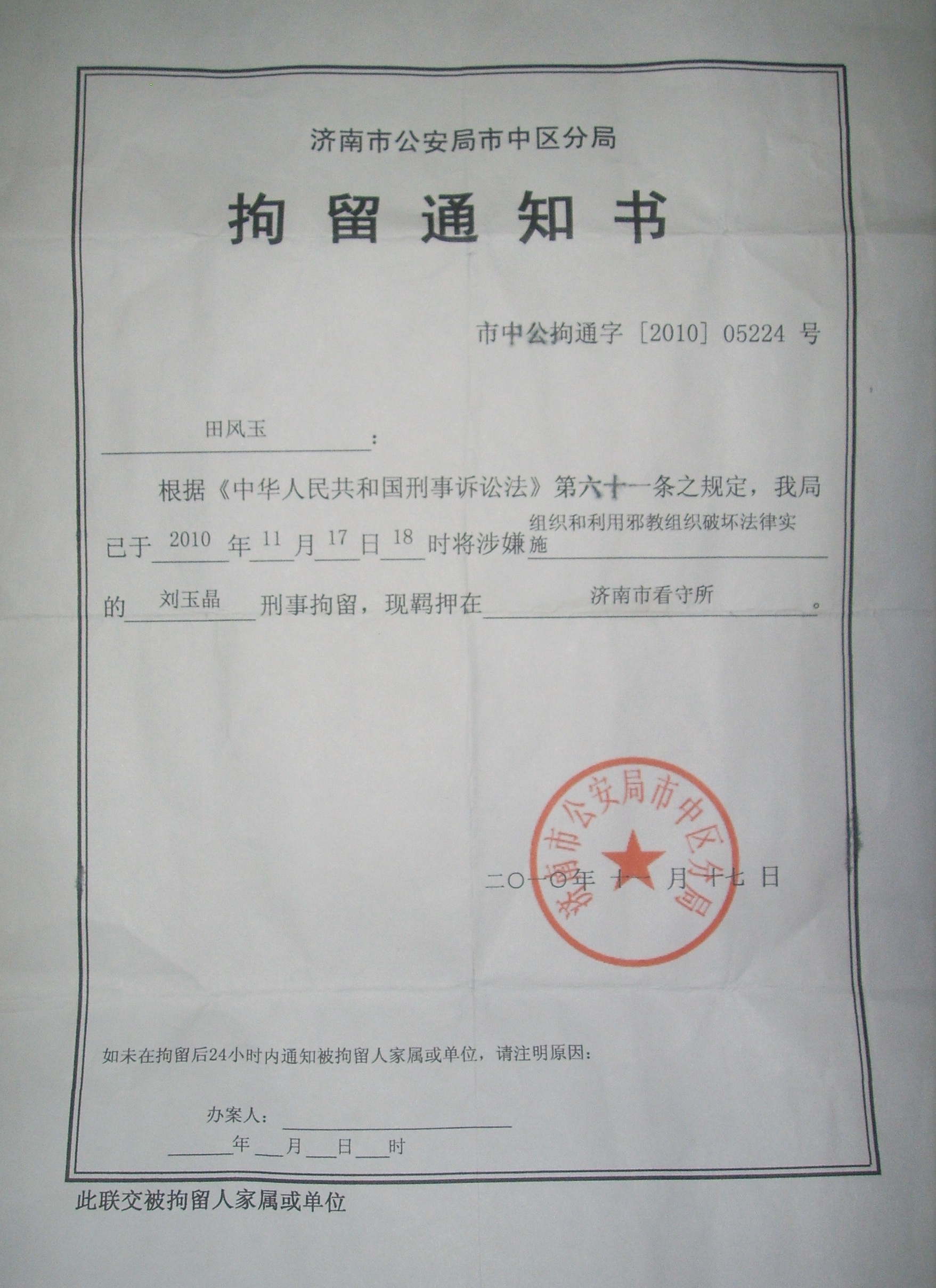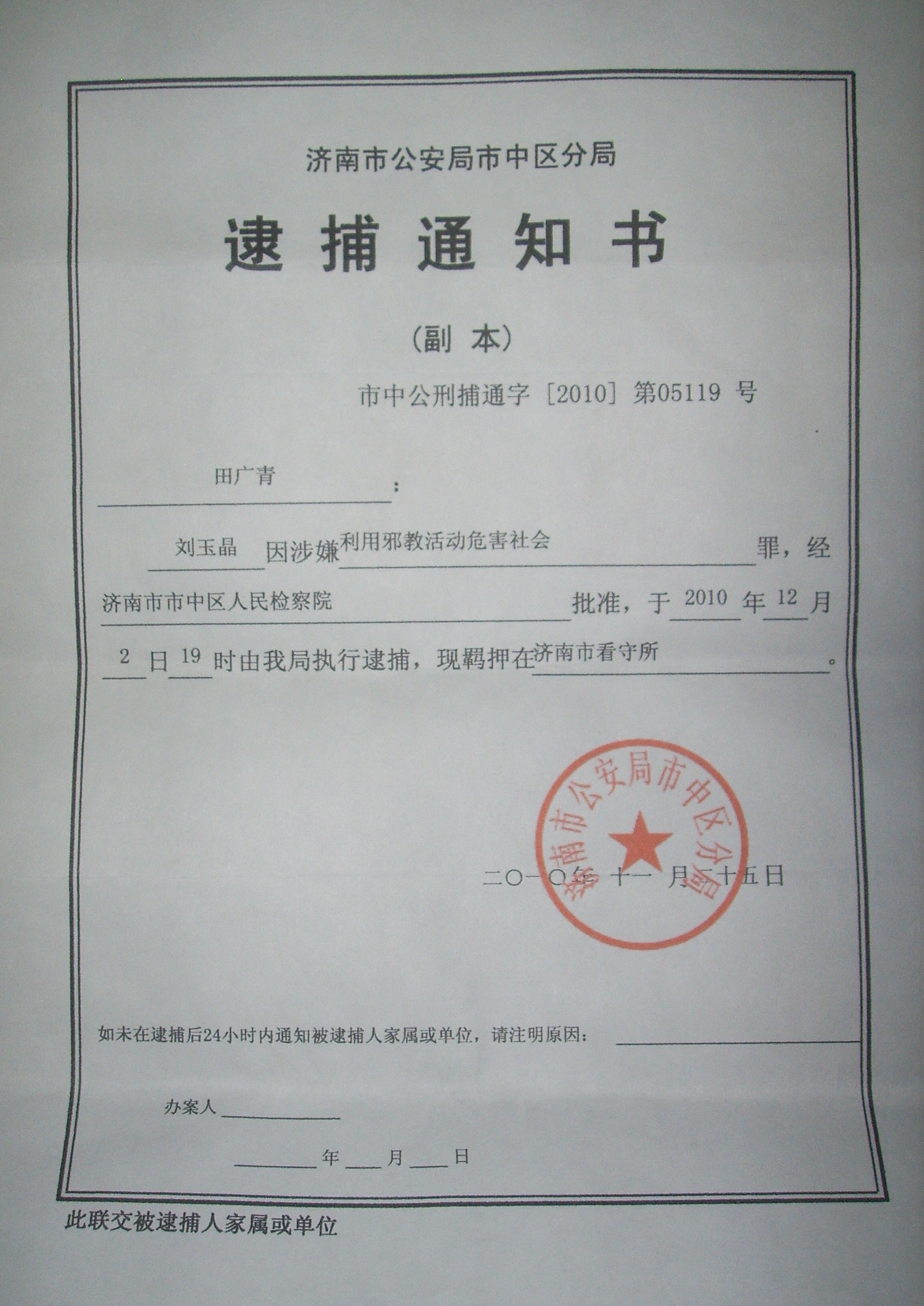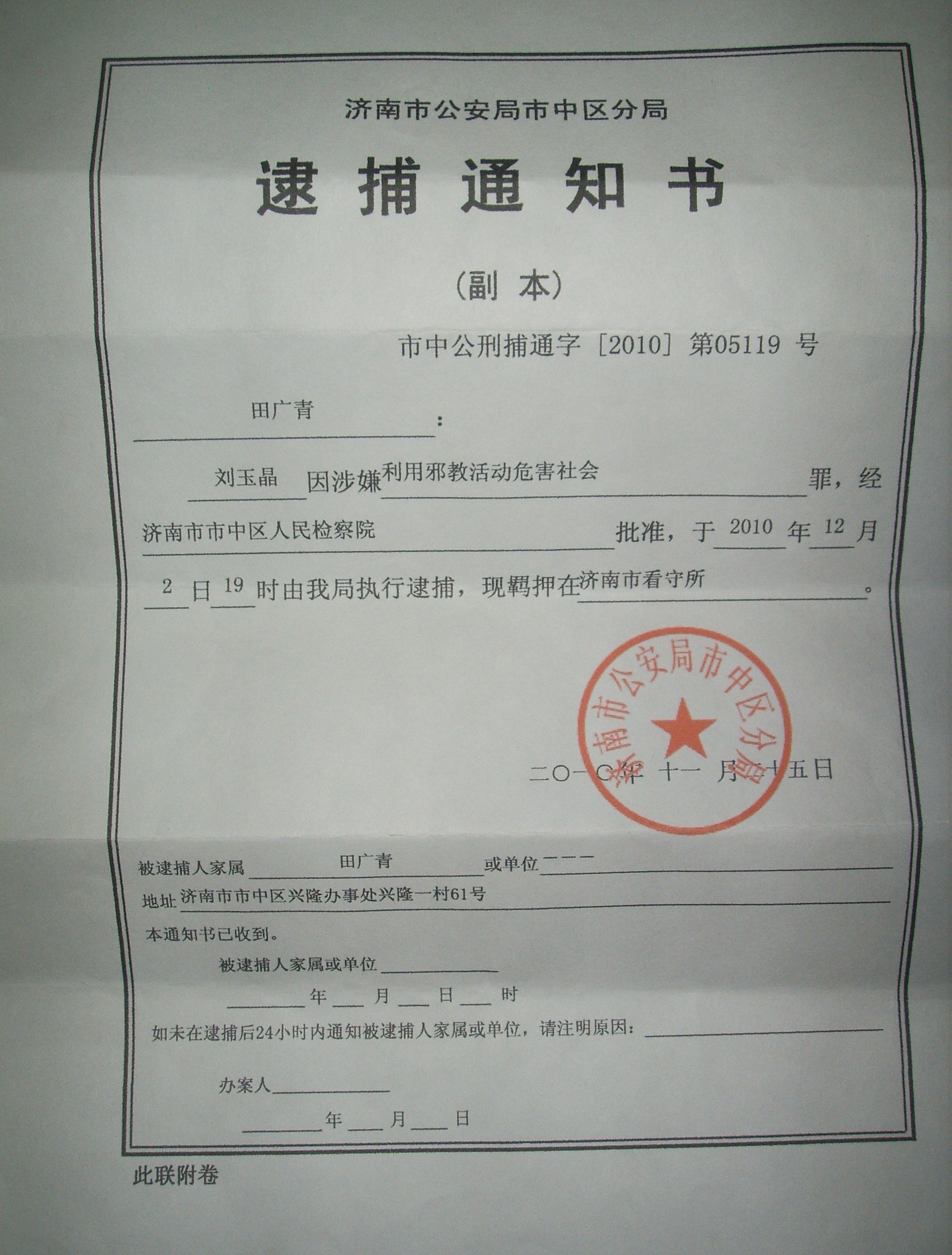 刘玉晶,是山东省济南市市中区兴隆村的善良农妇,她的丈夫和女儿都是安分正直的好人。二零一零年十一月十六日,刘玉晶从家中被绑架到十六里河派出所,家中被抄。十一月十七日,刘玉晶被非法刑事拘留,关押到济南市看守所。十二月二日,刘玉晶被非法批捕之后,济南市市中区中共法院定于二零一零年五月六日非法开庭审理。