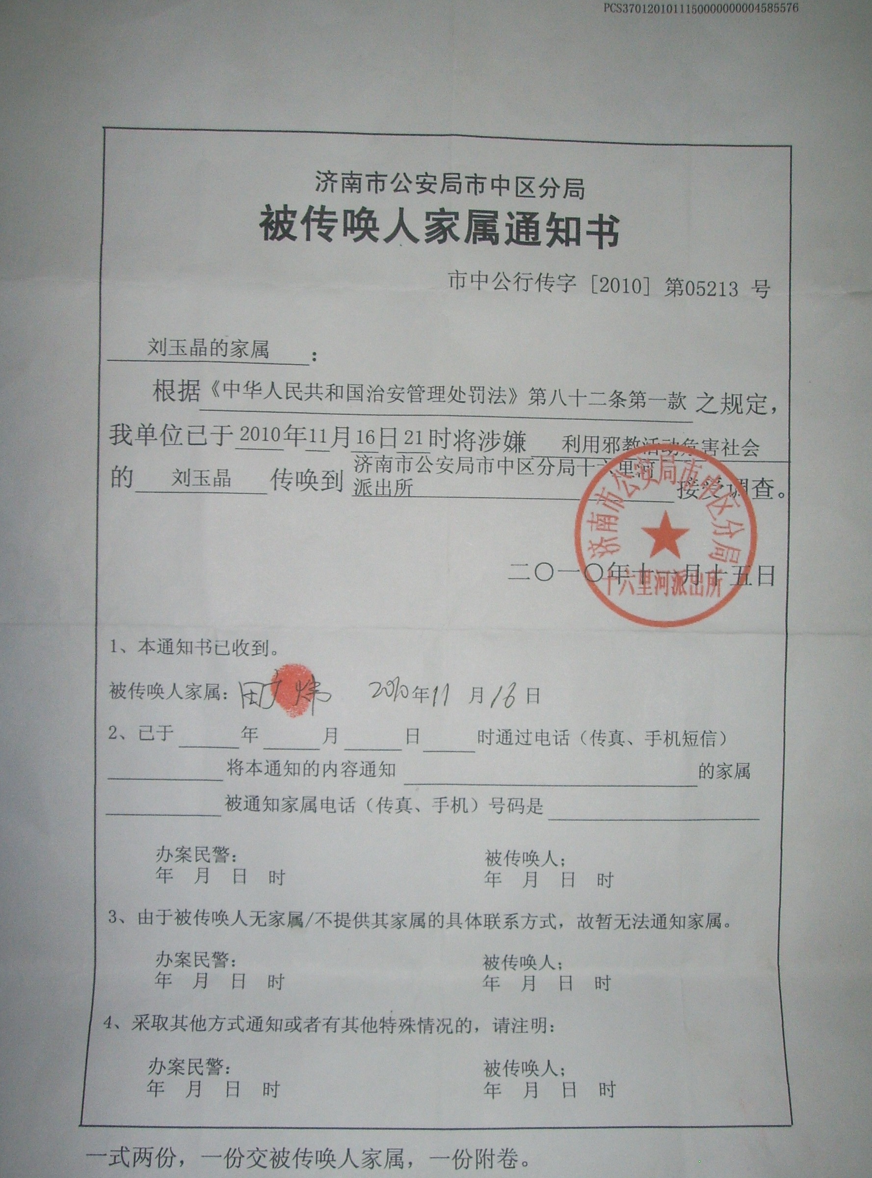 被传唤人家属通知书