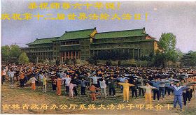 十一月十九日,合肥气温骤降,忽然下了一场雨雪,夹着冰雹,整整一天一夜。二十二日,阳光和煦,晴空万里,积雪无踪,师父在安徽省农业大学礼堂举办法轮功合肥第一期学习班。参加班的学员来自合肥本市的仅二百六十人左右,从外地“跟班”的学员不少,还包括省市高级干部也参加了班,约五百一十人左右。