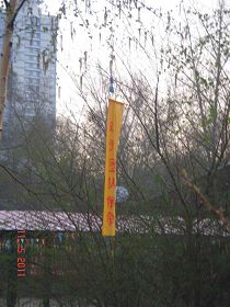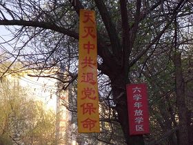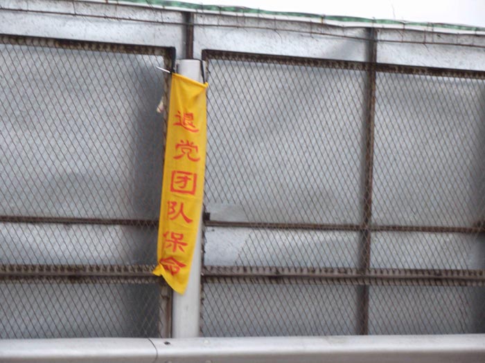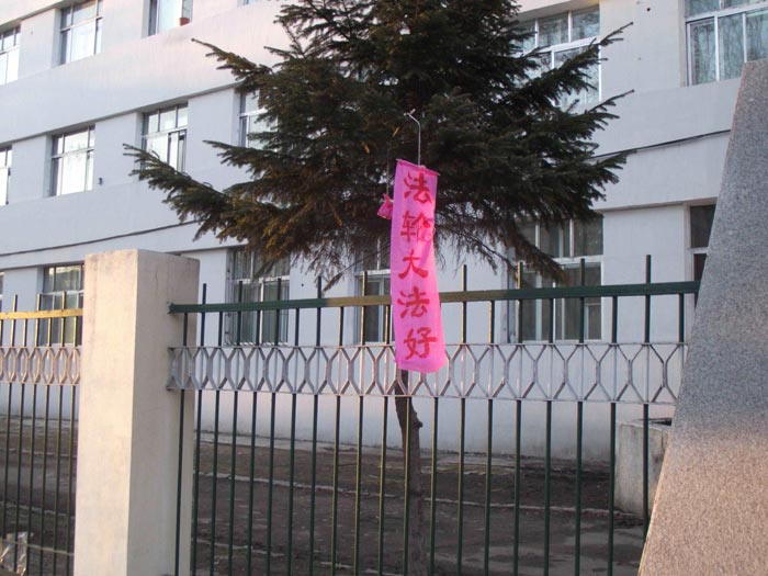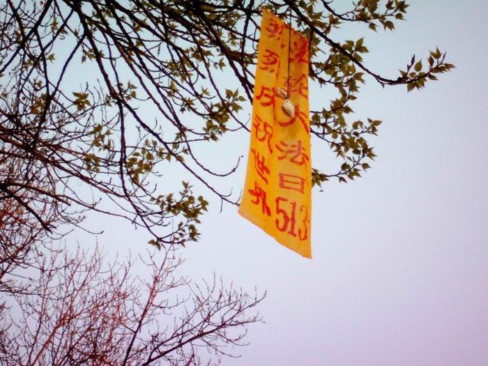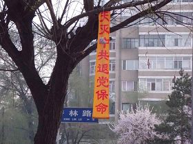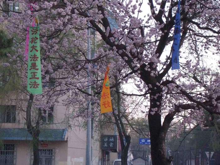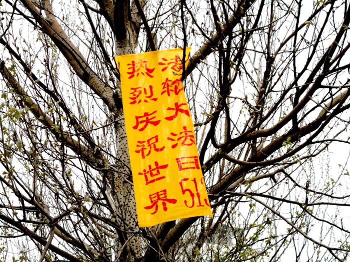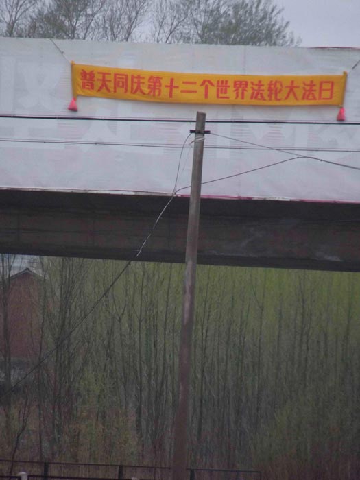 通讯员大陆报道)今年的五月十三日,是第十二届世界法轮大法日,是法轮大法洪传十九周年,是李洪志大师六十华诞。在中国大陆各地,出现很多庆祝“五一三”的真相条幅和标语。以下是出现在大陆某市的庆祝世界法轮大法日的真相条幅和胶贴。