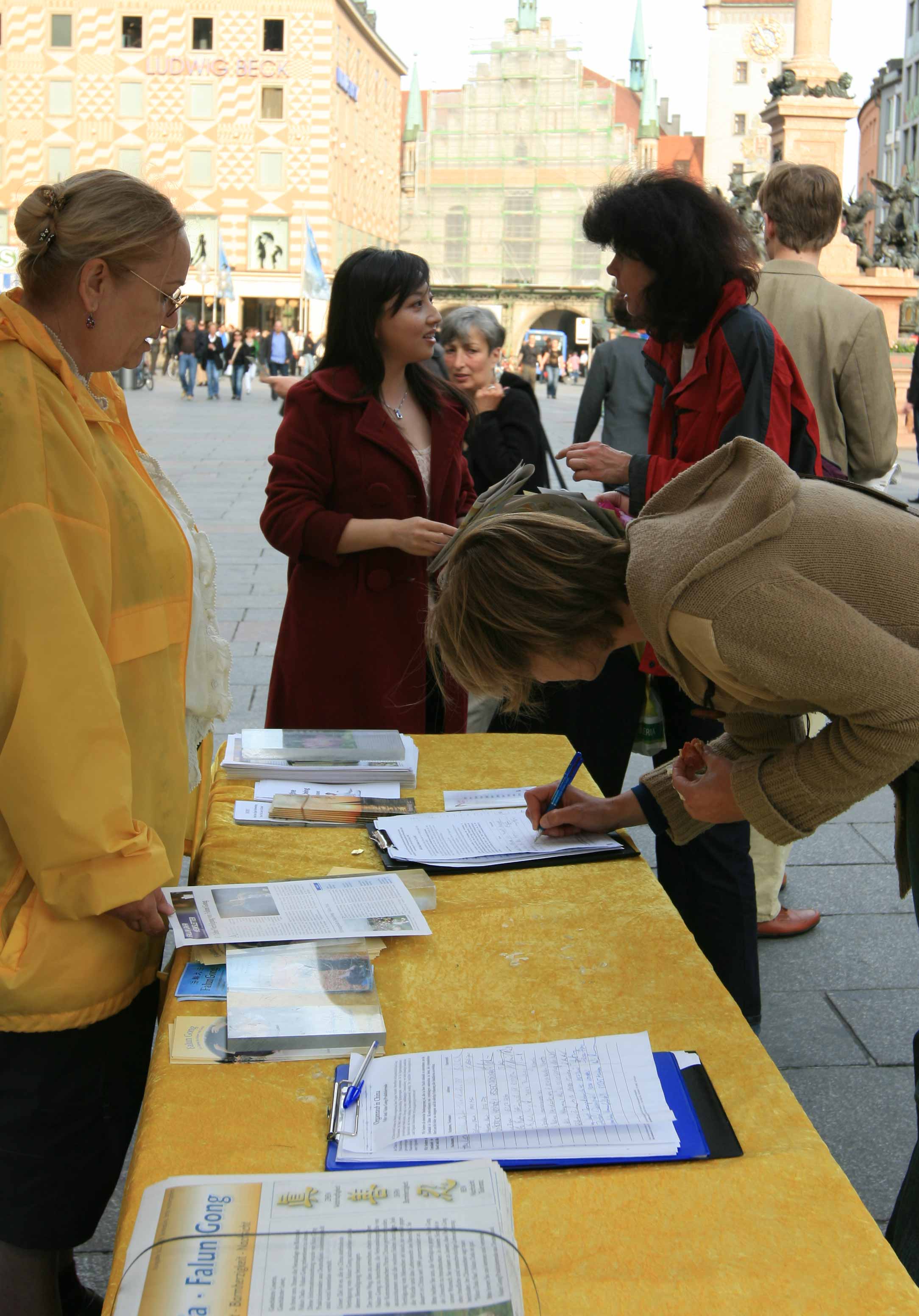 下午三点,部份慕尼黑和周边地区的法轮功学员聚集在市中心最繁华地带举办庆祝活动。学员们通过展示功法表演来向民众传达法轮功弘传世界的信息,优美舒缓的功法吸引了不少人驻足观看,有些人还跟着一起学习功法,不少人纷纷询问有关法轮功的信息,希望作进一步的了解。当人们了解到法轮功在中国大陆被迫害的情况,人们震惊了,不少人纷纷在制止中共迫害法轮功的签名簿上签名。