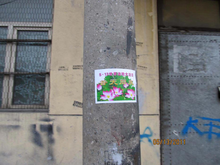 通讯员黑龙江报道)“五•一三”──世界法轮大法日,在这普天同庆的日子,黑龙江省某市大法弟子为恭贺师尊生日并祝贺“5•13世界法轮大法日”,在城市的大街小巷贴满了“普天同庆5•13世界法轮大法日”、“法轮大法好”的条幅和粘贴,令市民们眼前一亮。