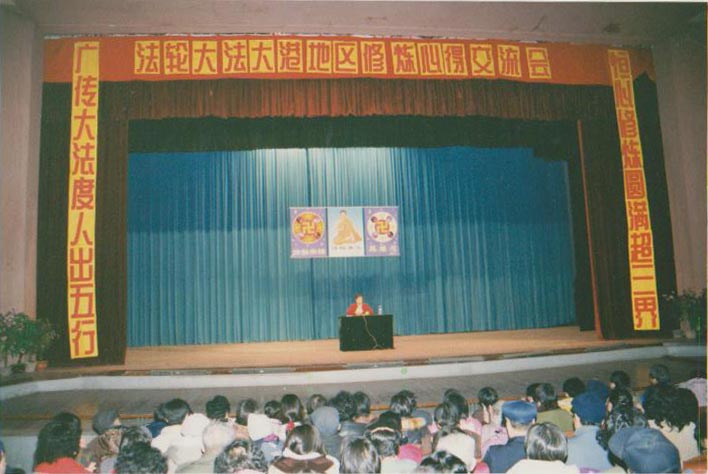 ![]() 法轮功学员在法会上交流修炼心得 |