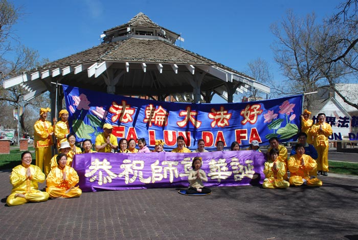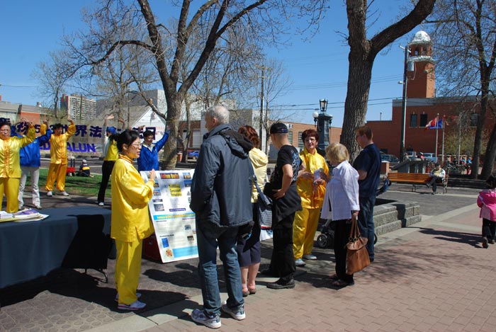 【明慧网二零一一年五月十六日】为庆祝世界法轮大法日和师父六十岁华诞,卡尔加里大法弟子于二零一一年五月十三日在该市中心的奥林匹克广场举行庆祝活动。活动的主要内容包括功法演示、有关法轮功的图片展、发放法轮功宣传资料、解答公众的疑问。