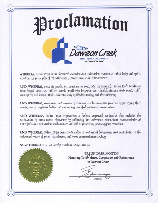 鉴此,我在此宣布二零一一年五月份为道森溪市的“法轮大法月”,赞颂“真、善、忍”。