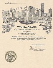 二零一一年五月十三日世界法轮大法日来临之际,美国休斯顿市议员旺达•亚当斯(Wanda Adams) 褒奖“世界法轮大法日”,褒奖奖状译文如下: