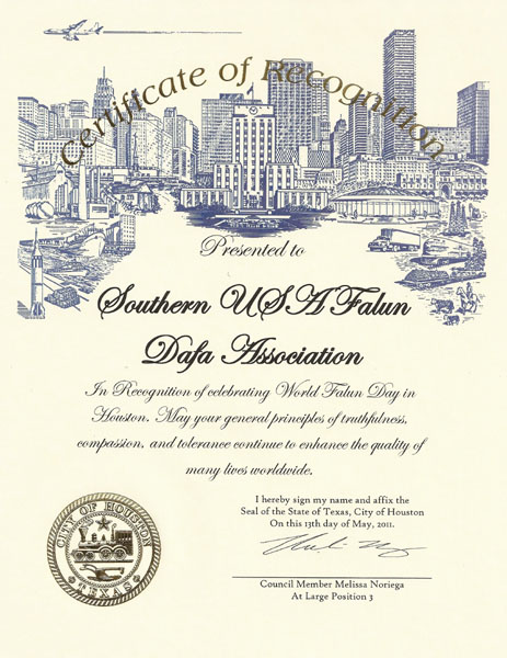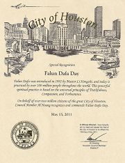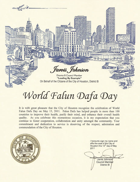休斯顿市于二零一一年五月十三日表彰庆祝法轮大法日,这是非常令人欣喜之事。法轮大法帮助一百多个国家成千上万的人改善了他们的身体健康、净化了心灵,整体提高了健康。你们欢度这个重大的日子之际,我期望你们继续合作、配合、增进社区的团结。你们的承诺与付出,值得休斯顿市的尊敬和表彰。