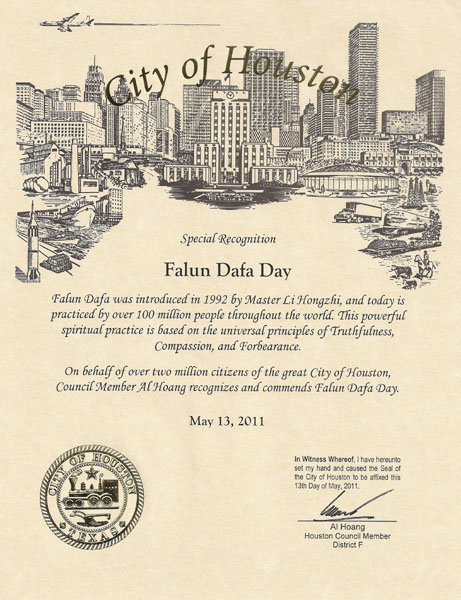 二零一一年五月十三日世界法轮大法日来临之际,美国休斯顿顿市议员、越南社区主席艾尔•洪(Al Hoang)褒奖“法轮大法日”,褒奖奖状译文如下: