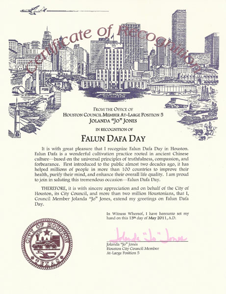 二零一一年五月十三日世界法轮大法日来临之际,美国休斯顿市议员琼兰达•琼斯(Jolanda Jones)褒奖“法轮大法日”,褒奖奖状译文如下: