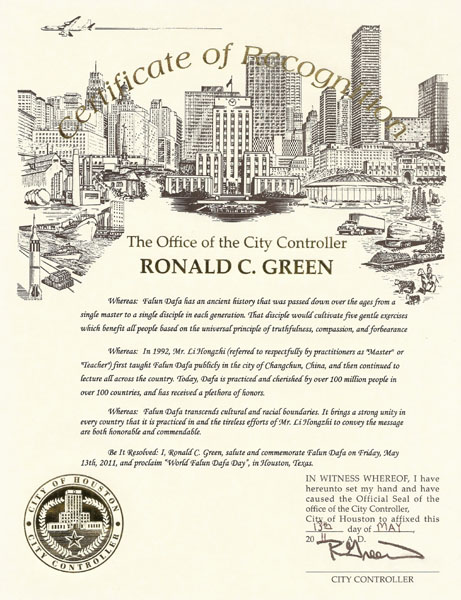 因此,我,罗纳德•格林(Ronald C Green),褒奖法轮大法,宣布二零一一年五月十三日星期五为德州休斯顿市