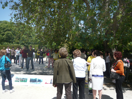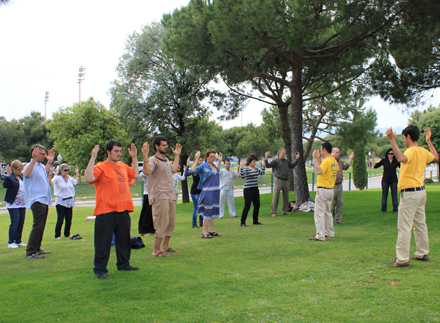 在西班牙首都马德里,法轮功学员来到著名的莱帝罗公园集体炼功、洪法,向世人介绍法轮大法并教授法轮功五套功法。