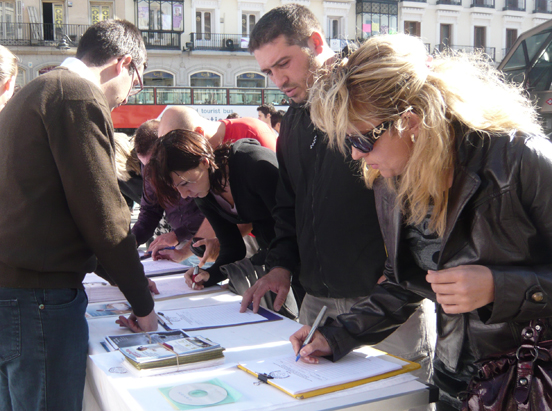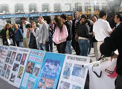 在庆祝世界法轮大法日期间,马德里的法轮功学员们在市中心最繁华的太阳广场,向民众讲述法轮功真相,征集反迫害签字,呼吁停止迫害。