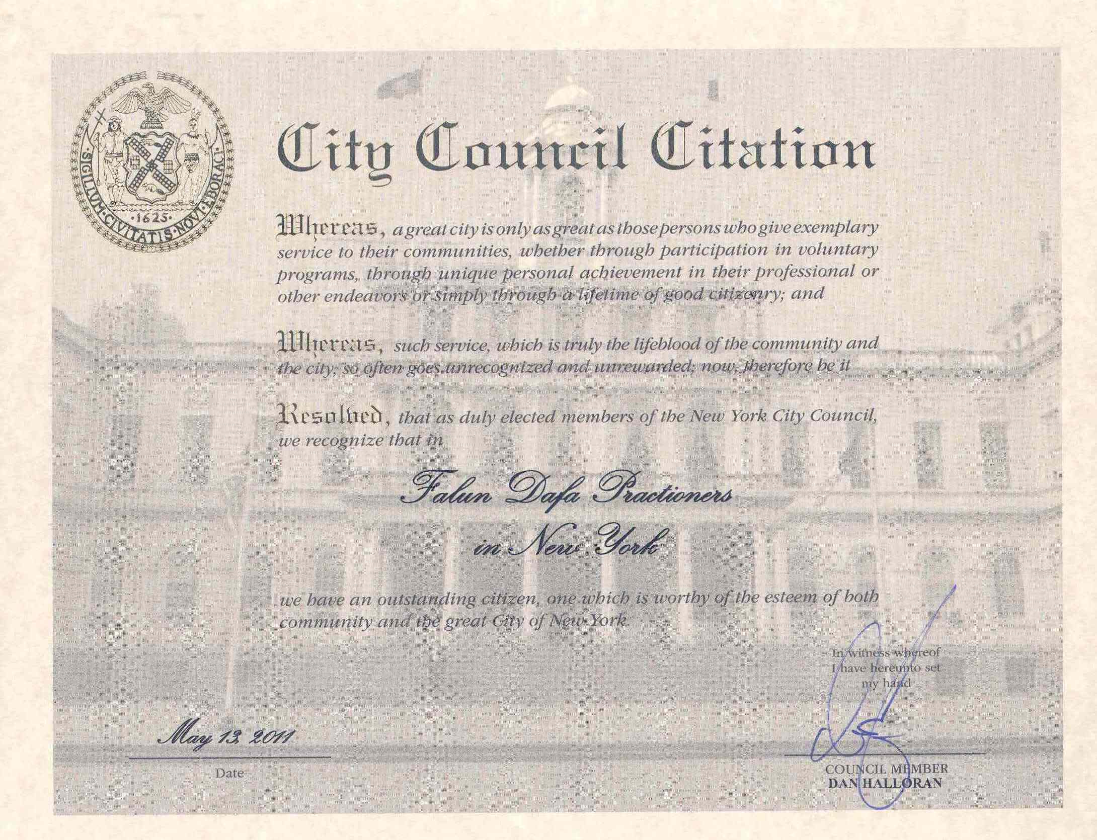 因此,作为被选举出来的纽约市议会成员,我们称赞纽约的法轮大法修炼者,我们有一群杰出的市民,值得社区和纽约市的尊重和感谢。