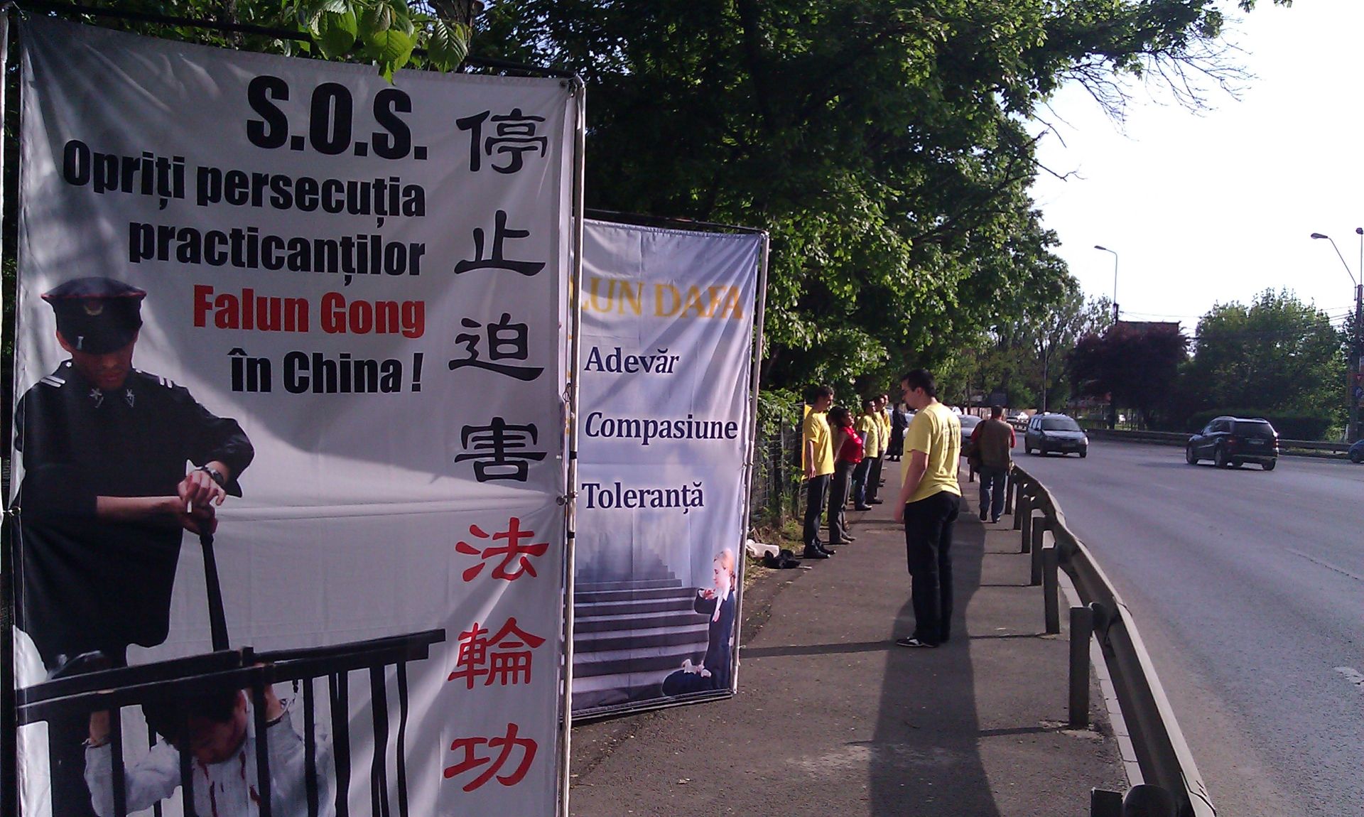 在布加勒斯特举办的另一项法轮大法日活动是在北京路,中共大使馆附近。罗马尼亚的大法弟子和来自英国、意大利、香港的大法弟子一起,和平地呼吁制止迫害。横幅上展示了中共迫害法轮功学员所用的近一百种酷刑迫害的方式,学员们并做了功法展示。