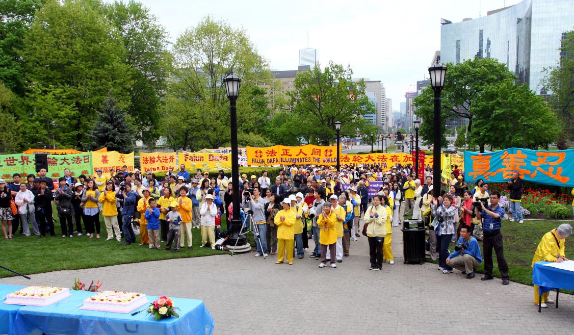 五月二十二日,一千多名法轮功学员及支持者在安省议会大楼前集会,庆祝法轮大法传世十九周年。