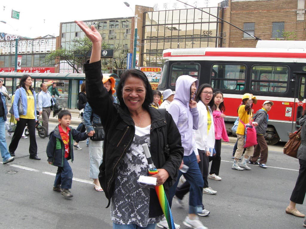 来自菲律宾的Myrla向着游行队伍挥手,她对记者说:“我的朋友介绍过法轮功给我,我一直没时间学炼功,今天看到有这么多的人是炼法轮功,我要马上回去开始学炼。另外,我们还要帮助那些还在中国受着迫害的法轮功学员。”