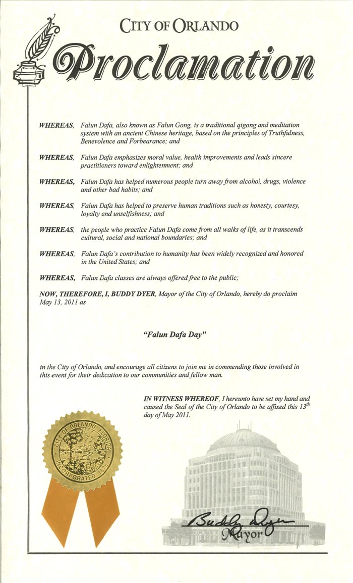 鉴此,我,巴迪·戴尔(Buddy Dyer),奥兰多市市长,宣布二零一一年五月十三日为奥兰多市