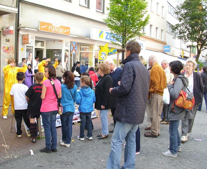 【明慧网二零一一年六月二日】三周前,德国四十万足球迷在西部城市多特蒙德刚刚为德甲冠军热烈欢庆了一番,本周,这里的人们又迎来了“国际文化周”,整个城市再次热闹起来。法轮功学员参加了二零一一年五月二十八日的国际文化周开幕式,各族裔的人们被来自东方的修炼文化深深吸引。