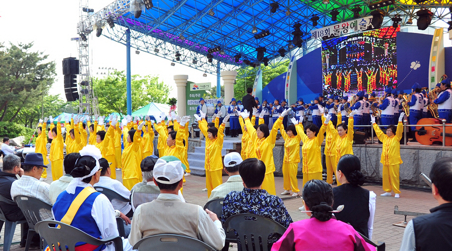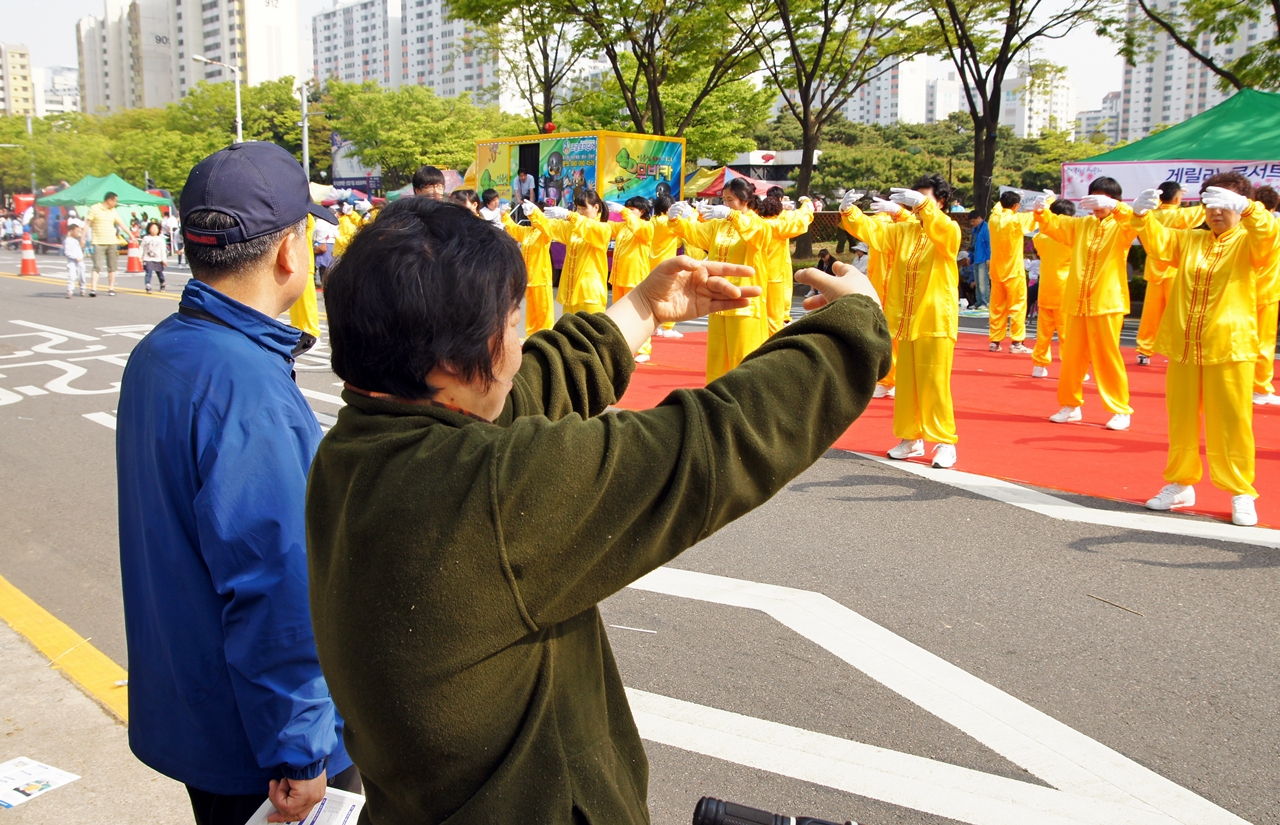 ![]() 韩国法轮功学员在博士谷艺术节庆典上演示功法,市民也跟着学炼动作 |