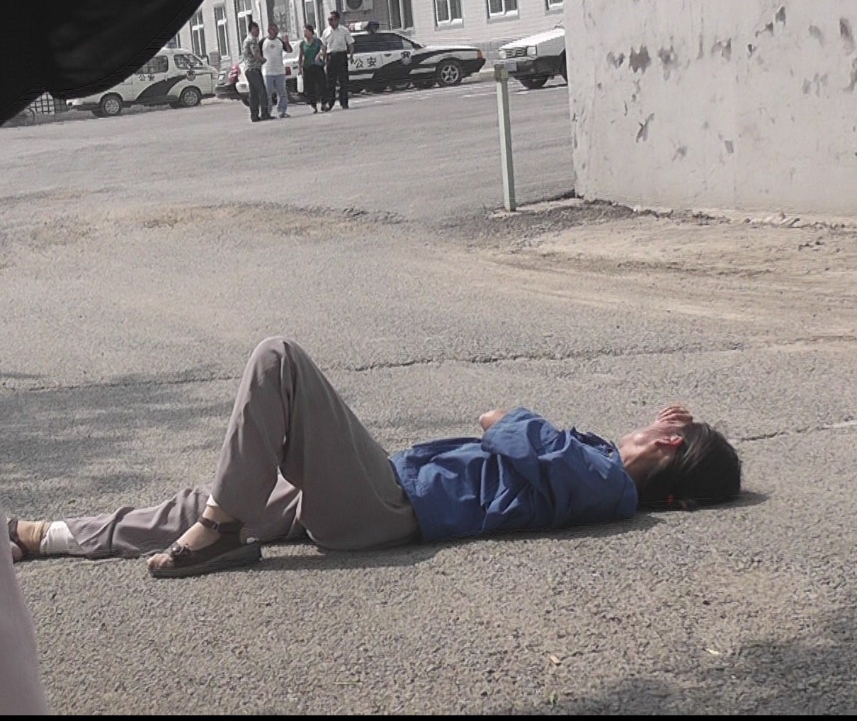 金鑫妻子倒在地上就未能从地上爬起来,直到现在下午五点多,六个多小时过去了,人还躺在那里。警察对倒在地上的人不管不问,还调来一辆白色轿车挡在金鑫妻子前面,以防外人看见。又令一个警察(便装)软磨硬泡要让金鑫妻子离开,还说用车送她去国保。今天是周末休息日,这无非是一句骗人离开,好脱离干系的话罢了。