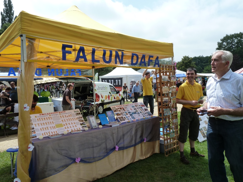 这天天气很好,阳光明媚,参加活动的游人很多。许多人阅读信息板上的法轮功介绍,通过和学员交谈了解法轮功。对功法感兴趣的人们,向学员了解梅赫伦炼功点的时间地点,表示希望学习法轮功。