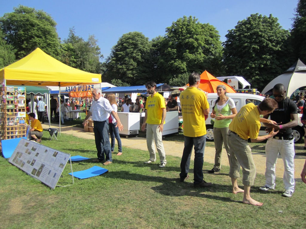 二零一一年六月五日,布鲁塞尔(Brussels)举办“大环境节”。法轮功学员的炼功场面吸引了很多参加活动的民众观看。一些有意愿学习法轮功的人很高兴地表示,希望第二天就到炼功点学功。