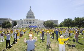 七月十四日早上,来自世界各地的法轮功学员汇聚在美国华府国会山,以集体炼功拉开了将持续三天的呼吁世界制止迫害的系列活动的序幕。