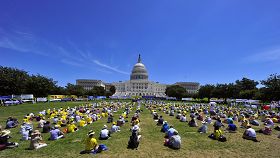 在法轮功反迫害十二周年之际,二零一一年七月十四日,逾千名来自世界各地的法轮功学员在美国首都华府国会山前,在炎炎烈日下和平炼功、集会,呼吁各界共同制止中共的残酷迫害。