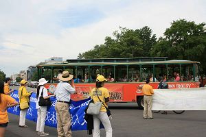 二零一一年七月十五日,来自世界各地的二千五百名法轮功学员,在美国首都华盛顿举办了“解体中共 停止迫害法轮功”、“声援一亿中国民众退出中共及相关组织”的大型游行集会,抗议中共对法轮功学员实行的人类有史以来最残酷的迫害。