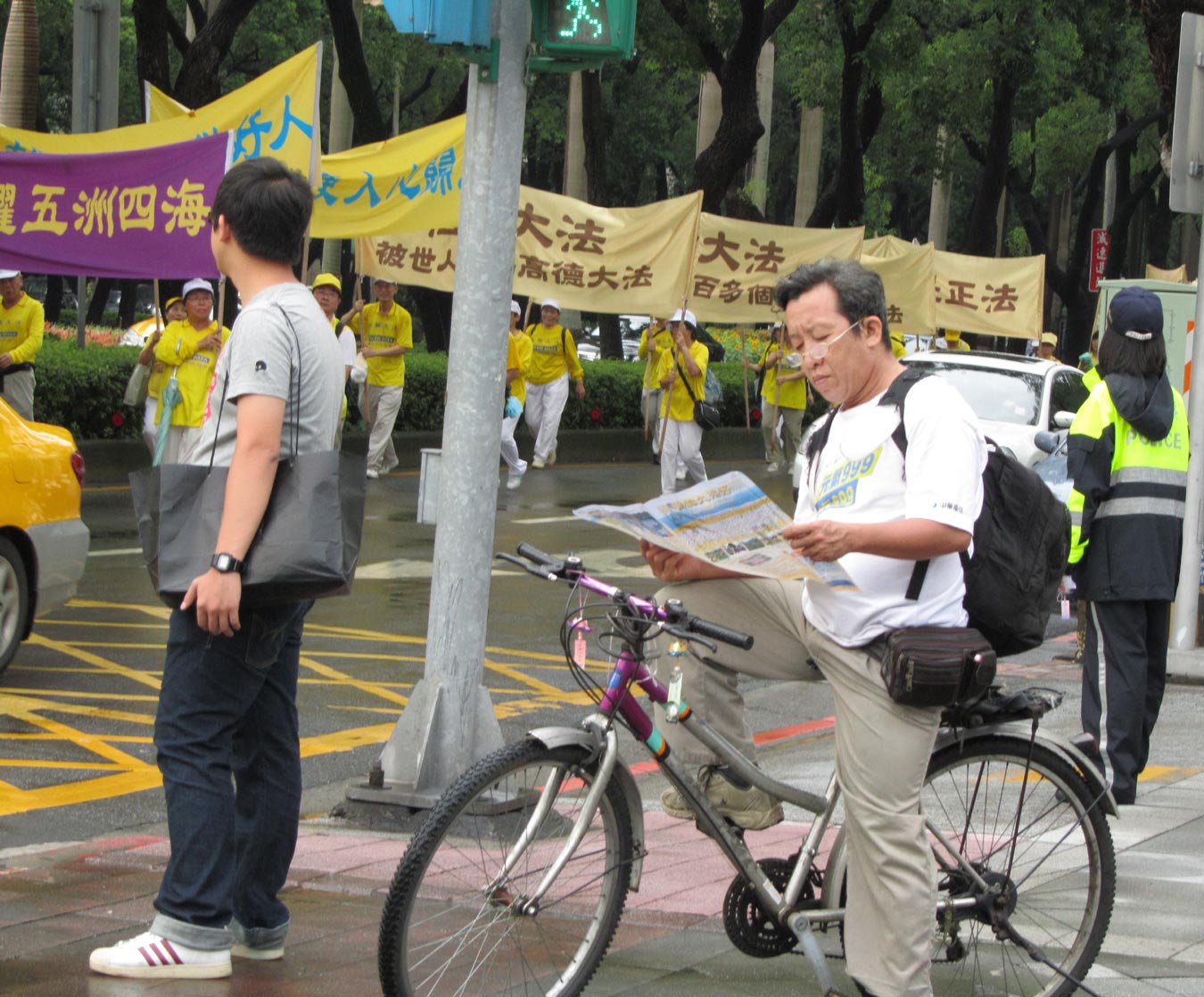 八十二岁的陈柏华老先生,带着外孙及外孙女参加游行活动,他手指着马路对面的大厦走廊说:“我女儿也来了,她在那边陪着美国来的朋友”。他因为眼见女儿陈紫云修炼法轮功后,身体健康,神清气朗,深受感动也跟着修炼大法已有八年多。陈老先生说:“以前我抽烟喝酒,小毛病很多。修炼后,很自然的烟酒都戒掉了,身体也硬朗了,改变非常大,以前我严重的时候连走路都不能走,现在我游行走全程几个小时都没问题。”他说:“大法弟子不怕风雨,我就是来告诉世人法轮大法好,中共的无理迫害应该予以制止。”