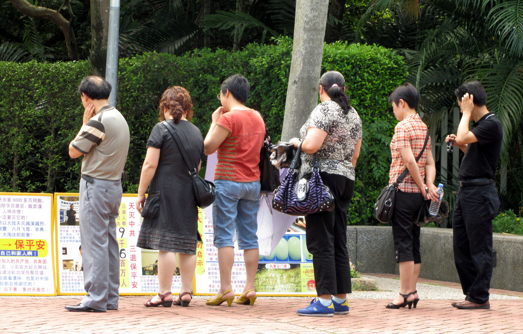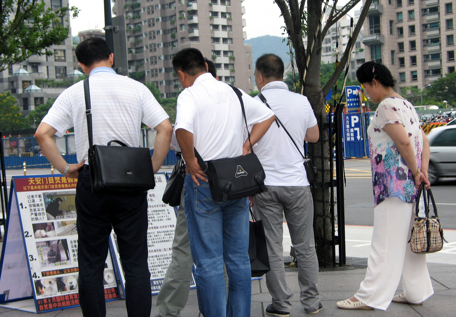 一零一景点前的大陆游客观看法轮功被迫害真相展板