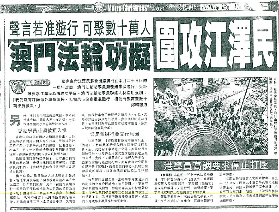 为揭露邪恶,法轮功学员十二月十七日下午在新口岸的露天餐厅举行记者招待会,声明江泽民到澳期间,法轮功学员为抗议江泽民对法轮功的迫害,将举行集会、游行。同时向记者介绍法轮功及揭露迫害的真相,并解答记者的有关提问。当时港澳很多媒体,美联社等记者与会并作了采访,会后作了比较客观的报导。