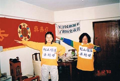 ![]() 在法轮功学员家里举行的记者招待会上,学员演示功法 |