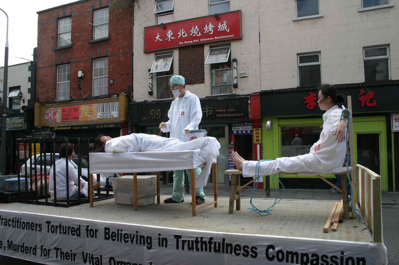 游行队伍中的模拟活摘器官酷刑展途经唐人街