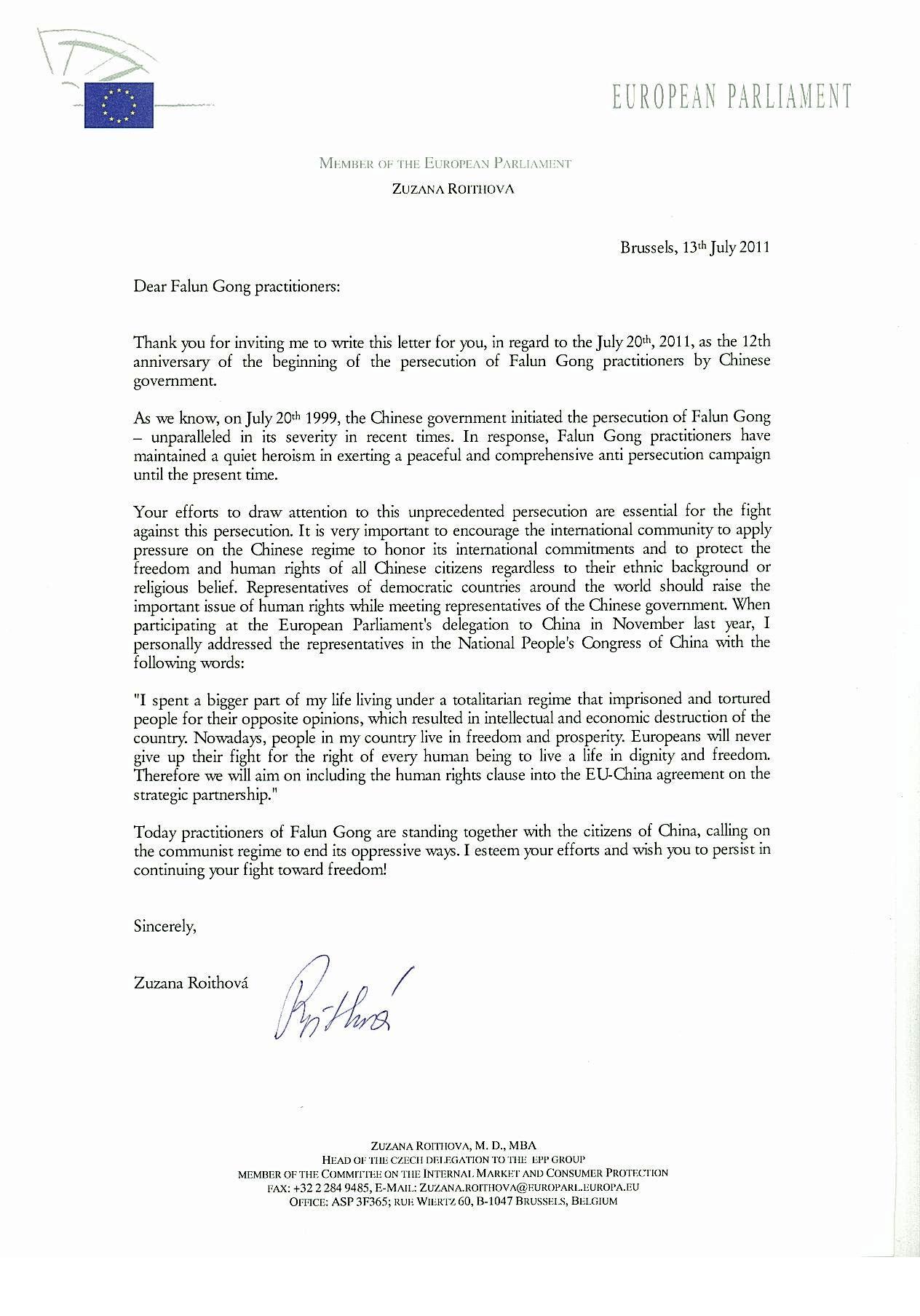 【明慧网二零一一年七月二十一日】至二零一一年七月二十日,中共对法轮功的残酷迫害已经长达十二年。欧洲议会议员、ACP-EU联合议会代表团副主席祖扎娜•瑞多凡(Zuzana Roithova)女士,欧洲议会议员安娜•戈麦斯(Ana Gomes)女士分别在七•二零之前致信法轮功学员,谴责中共的暴行,并表达她们对法轮功学员的声援。